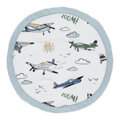 Airplane Green and Blue Collection Play Mats by Sweet Jojo Designs make tummy time and child development stylish and fun. Made with soft fabrics and fluffy fill, this multi-functional mat is small enough to take on the go. These adorable playmats will transform any room into the perfect play space. Great for vacations, playdates, beach outings, and everyday use at home. Always be aware of baby’s surroundings and keep an eye on baby while in use. Not intended for sleep. Sweet Jojo Designs creates various coordinating room accessories and decor for all of their children’s bedding and nursery bedding set collections (These items not included). Playmat is designed using a grey, yellow, green, gray, white and blue vintage airplanes transportation air plane clouds sun sky aviator aviation airplane print and finished with slate blue piping and border – Brushed Microfiber