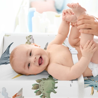 Watercolor Dinosaur Dino Collection Sweet Jojo Designs baby changing pad sheet covers is the perfect nursery essential. Use a changing mat cover sheet for extra protection and comfort for newborns and toddlers during outfit changes or changing diapers. And it’s always a good idea to buy extras so you can easily change it out when it’s time to wash. Sweet Jojo Designs offers coordinating crib bedding sets, receiving security blankets, nursing pillow covers and other baby room decor accessories (These items not included). This brushed microfiber diaper pad cover sheet features an exclusive design of a watercolor green slate steel turquoise blue tan mustard yellow orange and white dinosaur modern jurassic nature animal dino print.