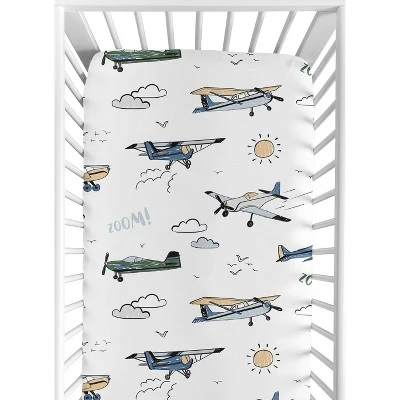 Airplane Green and Blue Collection Sweet Jojo Designs crib sheets two piece value pack are the perfect addition to your little one’s nursery and your next newborn essential. Using lightweight and durable material, these crib mattress sheets are made with soft fabrics and fully elastic bottom for a secure fit on most standard crib size. It’s always good to have multiple baby bedding sheets to use in between laundry wash days and easily change in case of emergencies. Pair your crib baby sheets with your favorite Sweet Jojo Designs crib bedding sets, receiving security blankets, changing pad covers and other baby room decor accessories (These items not included). Pack of 2 Brushed Microfiber Sheets Set – (1) Slate Blue Clouds Sky Print paired with (1) Grey Yellow Green and White Vintage Airplane Transportation Airplanes Aviator Air Plane Aviation Print