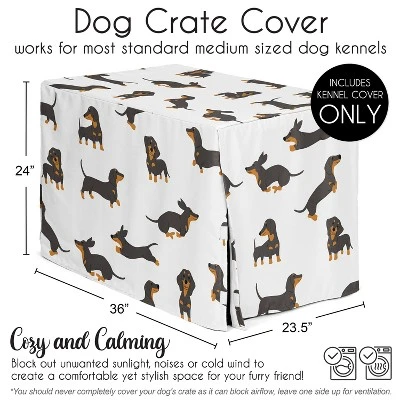 Cartoon Puppy Collection decorative dog crate cover creates a comforting environment for your loving pet . This 36 inch dog crate cover works for most standard medium sized dog crates as well as 1, 2 or 3 door dog cages. Using a kennel cover provides a sense of privacy, security, and comfort for dogs, cats, and animals of all sizes! By helping to reduce light and outside stimuli, anxious behaviors in your furry friends like unwanted barking and chewing will be a thing of the past. Block out unwanted sunlight, noises or cold wind to create a space even you will want to crawl into! Decorate your dogs cage by simply placing the cover along the top of the kennel and use the hook and loop closure to allow the flaps to be lowered or raised as needed and secured in place. Made with polyester fabric, this dog kennel cover is the perfect addition for any pet parent to ensure a cozy and stylish home that your companion loves! This cover can be used in your home, office, bedroom, mud room, living room or family room to turn your dog crate into a thoughtful home decor piece. Many of our wire crate covers coordinate with Sweet Jojo Designs home decor items such as decorative pillows, rugs, window valances and curtains. Please Note: DOES NOT INCLUDE DOG CRATE OR MAT. MODERN PET-FRIENDLY DECOR: This medium dog crate cover boasts an elegant design featuring tan beige and black modern, minimalist, puppy dogs cartoon wiener dog dachshund print. Machine washable. Tumble dry low. DOG KENNEL COVER ONLY – DOG CAGE/CRATE/KENNEL NOT INCLUDED.