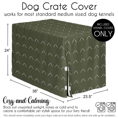 Woodland Arrow Green and White decorative dog crate cover creates a comforting environment for your loving pet . This 36 inch dog crate cover works for most standard medium sized dog crates as well as 1, 2 or 3 door dog cages. Using a kennel cover provides a sense of privacy, security, and comfort for dogs, cats, and animals of all sizes! By helping to reduce light and outside stimuli, anxious behaviors in your furry friends like unwanted barking and chewing will be a thing of the past. Block out unwanted sunlight, noises or cold wind to create a space even you will want to crawl into! Decorate your dogs cage by simply placing the cover along the top of the kennel and use the hook and loop closure to allow the flaps to be lowered or raised as needed and secured in place. Made with polyester fabric, this dog kennel cover is the perfect addition for any pet parent to ensure a cozy and stylish home that your companion loves! This cover can be used in your home, office, bedroom, mud room, living room or family room to turn your dog crate into a thoughtful home decor piece. Many of our wire crate covers coordinate with Sweet Jojo Designs home decor items such as decorative pillows, rugs, window valances and curtains. Please Note: DOES NOT INCLUDE DOG CRATE OR MAT. MODERN PET-FRIENDLY DECOR: This medium dog crate cover boasts an exclusive design featuring hunter forest green and white bohemian, southwest, herringbone, woodland, boho geometric arrow print. Machine washable. Tumble dry low. DOG KENNEL COVER ONLY – DOG CAGE/CRATE/KENNEL NOT INCLUDED.