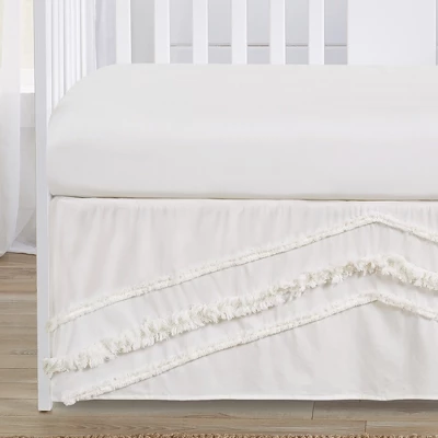 Boho Fringe Collection dust ruffle crib skirt will add a finishing touch to your nursery.  Decorate any room with this stylish mix and match piece or coordinate with an existing Sweet Jojo Designs ensemble to get a complete bedding set look. Sweet Jojo Designs creates various coordinating room accessories and decor for all of their children’s bedding and nursery set collections (These items not included). 100% Cotton – Solid Ivory Finished with a Tufted Trim