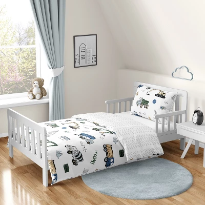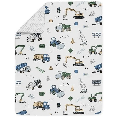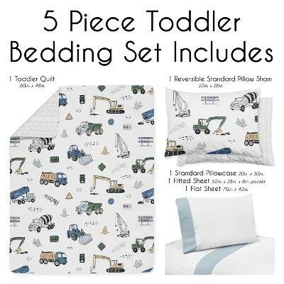 Construction Truck Green and Blue Collection Sweet Jojo Designs creates various coordinating room accessories for all of their children’s bedding sets including wall decor, hampers, lampshades and window treatments. Toddler set includes: Toddler Comforter, Fitted Sheet, Flat Sheet, Sham, and Pillow Case. Sweet Jojo Designs creates various coordinating room accessories and decor for all of their children’s bedding and nursery bedding set collections (These items not included). Features a blue, green, yellow, grey and black construction truck print with a coordinating tire print.