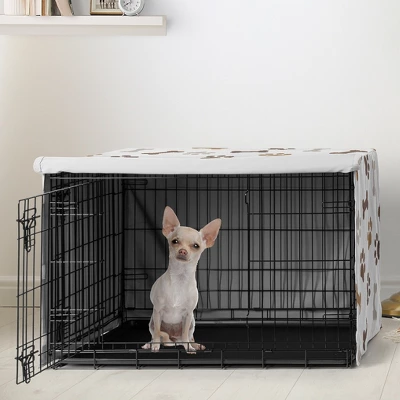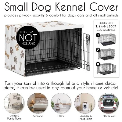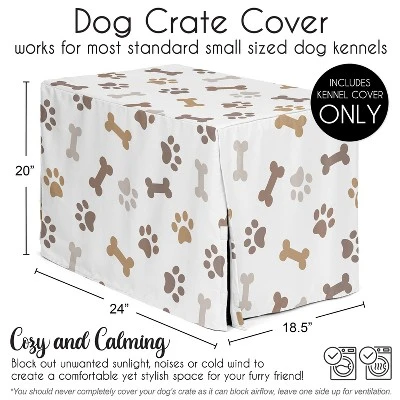 Paw and Bone Collection decorative dog crate cover creates a comforting environment for your loving pet . This 24 inch dog crate cover works for most standard small and medium sized dog crates as well as 1, 2 or 3 door dog cages. Using a kennel cover provides a sense of privacy, security, and comfort for dogs, cats, and animals of all sizes! By helping to reduce light and outside stimuli, anxious behaviors in your furry friends like unwanted barking and chewing will be a thing of the past. Block out unwanted sunlight, noises or cold wind to create a space even you will want to crawl into! Decorate your dogs cage by simply placing the cover along the top of the kennel and use the hook and loop closure to allow the flaps to be lowered or raised as needed and secured in place. This dog kennel cover is the perfect addition for any pet parent to ensure a cozy and stylish home that your companion loves! This cover can be used in your home, office, bedroom, mud room, living room or family room to turn your dog crate into a thoughtful home decor piece. Many of our wire crate covers coordinate with Sweet Jojo Designs home decor items such as decorative pillows, rugs, window valances and curtains. Please Note: DOES NOT INCLUDE DOG CRATE OR MAT. Featuring an exclusive fabric of grey, taupe, brown, off white, gray and tan puppy bone modern neutral paw prints.