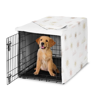 Desert Sun Collection decorative dog crate cover creates a comforting environment for your loving pet . This 36 inch dog crate cover works for most standard medium sized dog crates as well as 1, 2 or 3 door dog cages. Using a kennel cover provides a sense of privacy, security, and comfort for dogs, cats, and animals of all sizes! By helping to reduce light and outside stimuli, anxious behaviors in your furry friends like unwanted barking and chewing will be a thing of the past. Block out unwanted sunlight, noises or cold wind to create a space even you will want to crawl into! Decorate your dogs cage by simply placing the cover along the top of the kennel and use the hook and loop closure to allow the flaps to be lowered or raised as needed and secured in place. This dog kennel cover is the perfect addition for any pet parent to ensure a cozy and stylish home that your companion loves! This cover can be used in your home, office, bedroom, mud room, living room or family room to turn your dog crate into a thoughtful home decor piece. Many of our wire crate covers coordinate with Sweet Jojo Designs home decor items such as decorative pillows, rugs, window valances and curtains. Please Note: DOES NOT INCLUDE DOG CRATE OR MAT. Featuring an exclusive fabric of blush pink, gold, mauve and taupe bohemian mountains southwest nature outdoors minimalist geometric watercolor boho desert sun print.