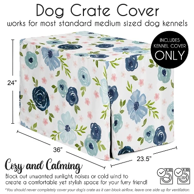 Watercolor Floral Navy Blue and Pink Collection decorative dog crate cover creates a comforting environment for your loving pet . This 36 inch dog crate cover works for most standard medium sized dog crates as well as 1, 2 or 3 door dog cages. Using a kennel cover provides a sense of privacy, security, and comfort for dogs, cats, and animals of all sizes! By helping to reduce light and outside stimuli, anxious behaviors in your furry friends like unwanted barking and chewing will be a thing of the past. Block out unwanted sunlight, noises or cold wind to create a space even you will want to crawl into! Decorate your dogs cage by simply placing the cover along the top of the kennel and use the hook and loop closure to allow the flaps to be lowered or raised as needed and secured in place. This dog kennel cover is the perfect addition for any pet parent to ensure a cozy and stylish home that your companion loves! This cover can be used in your home, office, bedroom, mud room, living room or family room to turn your dog crate into a thoughtful home decor piece. Many of our wire crate covers coordinate with Sweet Jojo Designs home decor items such as decorative pillows, rugs, window valances and curtains. Please Note: DOES NOT INCLUDE DOG CRATE OR MAT. Featuring an exclusive fabric of blush pink, grey, navy blue, gray and white boho floral bohemian farmhouse shabby chic rose lily elegant watercolor flowers print.