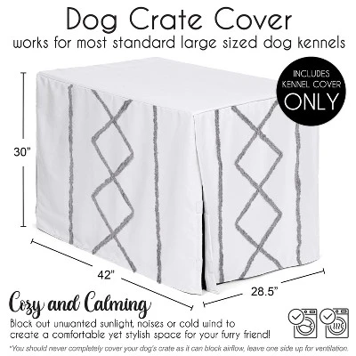 Boho Fringe White and Grey Collection decorative dog crate cover creates a comforting environment for your loving pet . This 42 inch dog crate cover works for most standard medium and large sized dog crates as well as 1, 2 or 3 door dog cages. Using a kennel cover provides a sense of privacy, security, and comfort for dogs, cats, and animals of all sizes! By helping to reduce light and outside stimuli, anxious behaviors in your furry friends like unwanted barking and chewing will be a thing of the past. Block out unwanted sunlight, noises or cold wind to create a space even you will want to crawl into! Decorate your dogs cage by simply placing the cover along the top of the kennel and use the hook and loop closure to allow the flaps to be lowered or raised as needed and secured in place. This dog kennel cover is the perfect addition for any pet parent to ensure a cozy and stylish home that your companion loves! This cover can be used in your home, office, bedroom, mud room, living room or family room to turn your dog crate into a thoughtful home decor piece. Many of our wire crate covers coordinate with Sweet Jojo Designs home decor items such as decorative pillows, rugs, window valances and curtains. Please Note: DOES NOT INCLUDE DOG CRATE OR MAT. Featuring an exclusive fabric of white and grey bohemian macrame fringe and tufted trimmings.