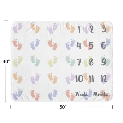 Baby Footprints Collection Sweet Jojo Designs 3 Piece Milestone Baby Blankets offer the perfect prop to help you capture monthly growth achievements. Each blanket features the numbers 1-12 and two soft frames that you can easily place over the numbers to correspond with your little one’s age in months and weeks. They make an adorable backdrop for all your baby’s photos as you celebrate each month of their first year or use as a security blanket, nursery receiving swaddle, tummy time floor playmat, or even a stroller or car seat cover. Add these lightweight blankets to any new parent list or give as the best keepsake baby shower gift. Snapshots taken with this soft infancy chart tracker will help you make the most precious social media posts to share on your wall or feed for friends, family, and followers to enjoy. No filter needed! Pair your blanket with your favorite Sweet Jojo Designs crib bedding sets, receiving security blankets, changing pad covers, crib sheets and other baby room decor accessories (These items not included). 100% plush minky fleece featuring a multicolor rainbow colors of red, orange, yellow, green, blue and purple birthday party baby foot prints.