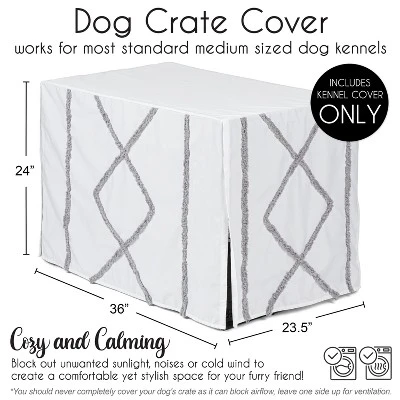 Boho Fringe White and Grey Collection decorative dog crate cover creates a comforting environment for your loving pet . This 36 inch dog crate cover works for most standard medium sized dog crates as well as 1, 2 or 3 door dog cages. Using a kennel cover provides a sense of privacy, security, and comfort for dogs, cats, and animals of all sizes! By helping to reduce light and outside stimuli, anxious behaviors in your furry friends like unwanted barking and chewing will be a thing of the past. Block out unwanted sunlight, noises or cold wind to create a space even you will want to crawl into! Decorate your dogs cage by simply placing the cover along the top of the kennel and use the hook and loop closure to allow the flaps to be lowered or raised as needed and secured in place. This dog kennel cover is the perfect addition for any pet parent to ensure a cozy and stylish home that your companion loves! This cover can be used in your home, office, bedroom, mud room, living room or family room to turn your dog crate into a thoughtful home decor piece. Many of our wire crate covers coordinate with Sweet Jojo Designs home decor items such as decorative pillows, rugs, window valances and curtains. Please Note: DOES NOT INCLUDE DOG CRATE OR MAT. Featuring an exclusive fabric of white and grey bohemian macrame fringe and tufted trimmings.