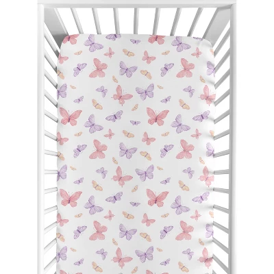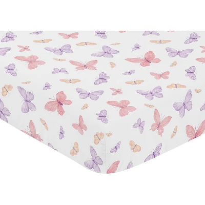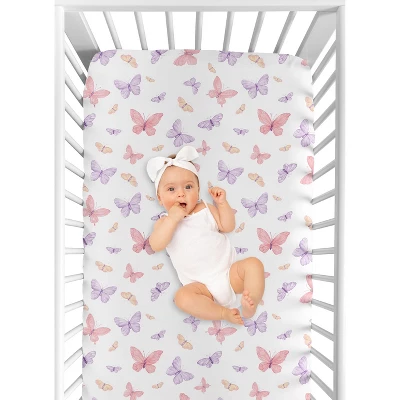 Butterfly Sweet Jojo Designs crib sheets are a stylish upgrade to your baby nursery or toddler bedroom and sure to be your favorite newborn essential. Using lightweight and durable material, this crib mattress sheet is made with soft fabrics and fully elastic bottom for a secure fit on most standard crib size and toddler beds. Don’t forget to buy extras! It’s always good to have multiple baby bedding sheets to use in between laundry wash days and easily change in case of emergencies. Pair your crib baby sheet with your favorite Sweet Jojo Designs crib bedding sets, receiving security blankets, changing pad covers and other baby room decor accessories (These items not included). This brushed microfiber crib sheet features an exclusive design of a blush pink, purple lavender and yellow shabby chic colorful pastel lilac watercolor butterfly pattern.