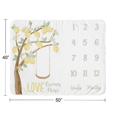 Lemon Collection Sweet Jojo Designs 3 Piece Milestone Baby Blankets offer the perfect prop to help you capture monthly growth achievements. Each blanket features the numbers 1-12 and two soft frames that you can easily place over the numbers to correspond with your little one’s age in months and weeks. They make an adorable backdrop for all your baby’s photos as you celebrate each month of their first year or use as a security blanket, nursery receiving swaddle, tummy time floor playmat, or even a stroller or car seat cover. Add these lightweight blankets to any new parent list or give as the best keepsake baby shower gift. Snapshots taken with this soft infancy chart tracker will help you make the most precious social media posts to share on your wall or feed for friends, family, and followers to enjoy. No filter needed! Pair your blanket with your favorite Sweet Jojo Designs crib bedding sets, receiving security blankets, changing pad covers, crib sheets and other baby room decor accessories (These items not included). 100% plush minky fleece featuring a yellow, green and brown lemon tree with an inspirational “Love Grows Here” quote.