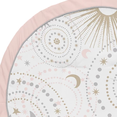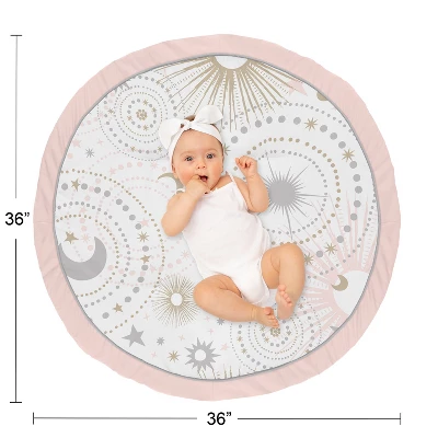 Celestial Pink and Gold Collection Play Mats by Sweet Jojo Designs make tummy time and child development stylish and fun. Made with soft fabrics and fluffy fill, this multi-functional mat is small enough to take on the go. These adorable playmats will transform any room into the perfect play space. Great for vacations, playdates, beach outings, and everyday use at home. Always be aware of baby’s surroundings and keep an eye on baby while in use. Not intended for sleep. Sweet Jojo Designs creates various coordinating room accessories and decor for all of their children’s bedding and nursery bedding set collections (These items not included). Playmat is designed using a blush pink, grey and gold celestial print with grey piping and a blush pink border – Brushed Microfiber