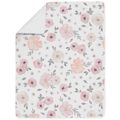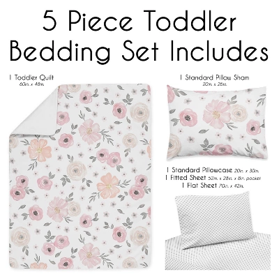 Watercolor Floral Pink and Grey Collection Sweet Jojo Designs creates various coordinating room accessories for all of their children’s bedding sets including wall decor, hampers, lampshades and window treatments. Toddler set includes: Toddler Comforter, Fitted Sheet, Flat Sheet, Sham, and Pillow Case. Sweet Jojo Designs creates various coordinating room accessories and decor for all of their children’s bedding and nursery bedding set collections (These items not included). Features blush pink and grey shabby chic bohemian farmhouse boho floral watercolor gray and white rose lily elegant flowers for the Watercolor Floral Pink and Grey Collection.