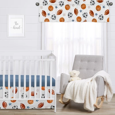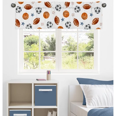 Watercolor Sports Theme Collection Sweet Jojo Designs window valance will help decorate and upgrade any room in your home. This beautiful window valance is designed to fit most standard windows. This valance softens the look of the window and obscures pulled up blinds. Sweet Jojo Designs creates various coordinating room accessories and decor for all of their children’s bedding and nursery bedding set collections or can be used as an accent with your own room design (These items not included). Brushed Microfiber – Watercolor Vintage Sports Theme Soccer Balls Football Baseball Basketball Blue Stars Sport Themed Print